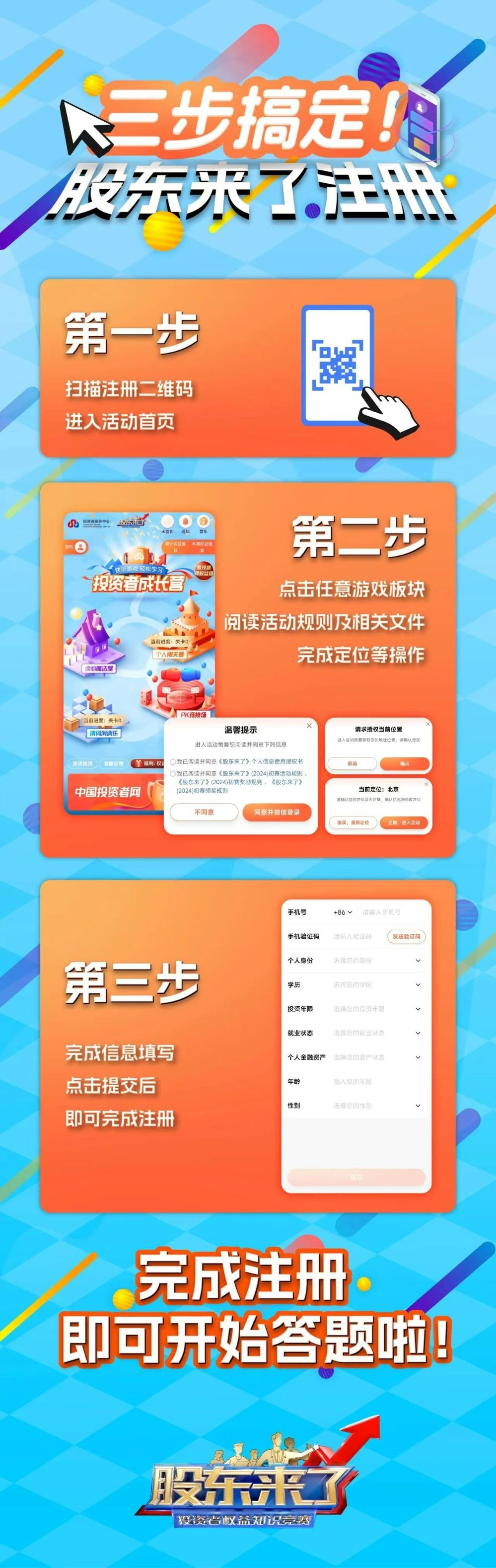 《股東來了》(2024)于2024年5月15日至7月9日舉辦,分為網(wǎng)絡(luò)初賽和電視決賽兩個(gè)階段:初賽于5月15日啟動(dòng),以網(wǎng)絡(luò)答題形式開展,共持續(xù)8周,玩法包括讀心魔法屋、個(gè)人闖關(guān)賽、猜詞消消樂、PK競技場等;電視決賽以戰(zhàn)隊(duì)對戰(zhàn)形式開展,擬于3季度錄制,計(jì)劃于4季度在湖南衛(wèi)視等平臺(tái)播出。本次活動(dòng)設(shè)置上海、江蘇、西藏、深圳四大片區(qū),覆蓋全國36個(gè)證監(jiān)局轄區(qū)及港澳臺(tái)地區(qū)。
