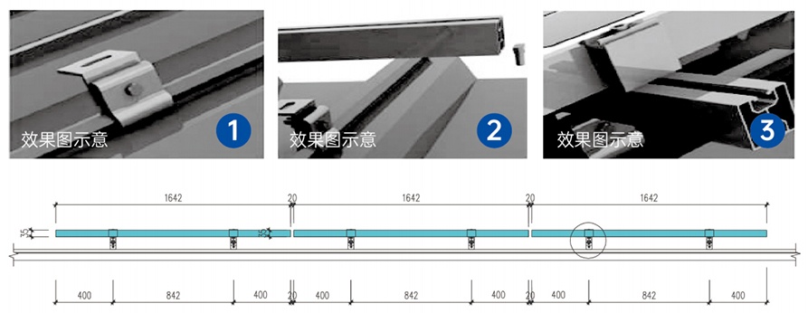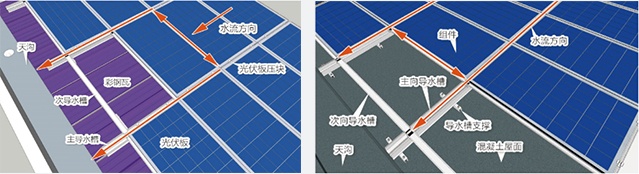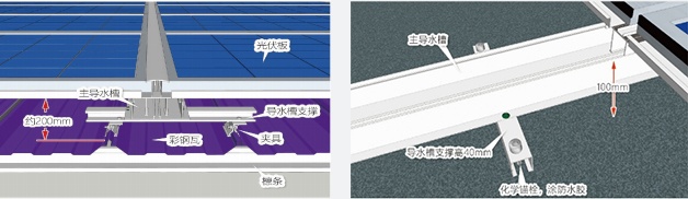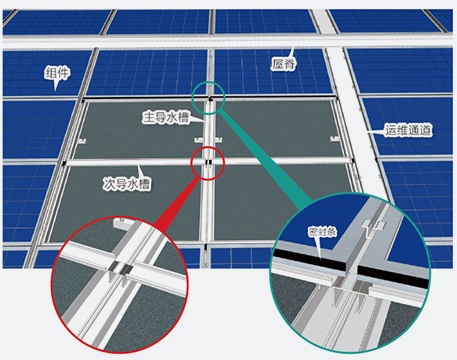 芯屋頂 BIPV 系統(tǒng)結(jié)構(gòu)縱橫方向分別由主導(dǎo)水槽與次導(dǎo)水槽組成,下雨時(shí),雨水流過(guò)光伏板并沿主次導(dǎo)水槽排向天溝,實(shí)現(xiàn)雙倍防水效果。