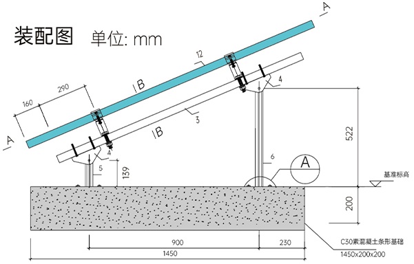 混凝土屋面采用預(yù)制條形混凝土基礎(chǔ),直接安放在屋面上,不對(duì)屋面進(jìn)行二次破壞,確保屋面不漏水,并起到有效隔熱作用,每平方米荷載小于50kg。